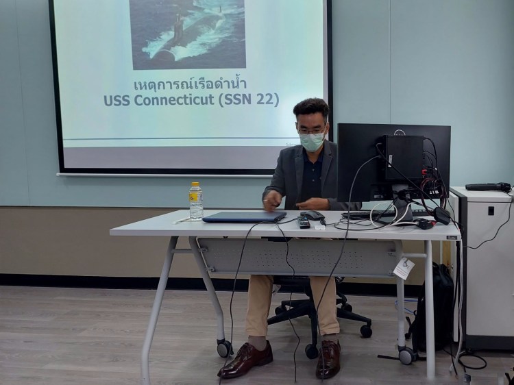 วิทยากรพิเศษ บรรยายสรุปเหตุการอุบัติเหตุเรือดำน้ำสหรัฐฯ ชนพื้นใต้น้ำ ให้กับกองเวชศาสตร์ใต้น้ำและการบิน กรมแพทย์ทหารเรือ กรกฎาคม 2565