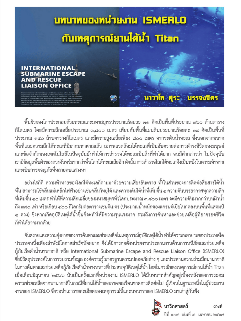 “บทบาทของหน่วยงาน ISMERLO กับเหตุการณ์ยานใต้น้ำ Titan” นาวิกศาสตร์ นิตยสารรายเดือนของกองทัพเรือ ปีที่ 107 ฉบับที่ 4 เมษายน 2567