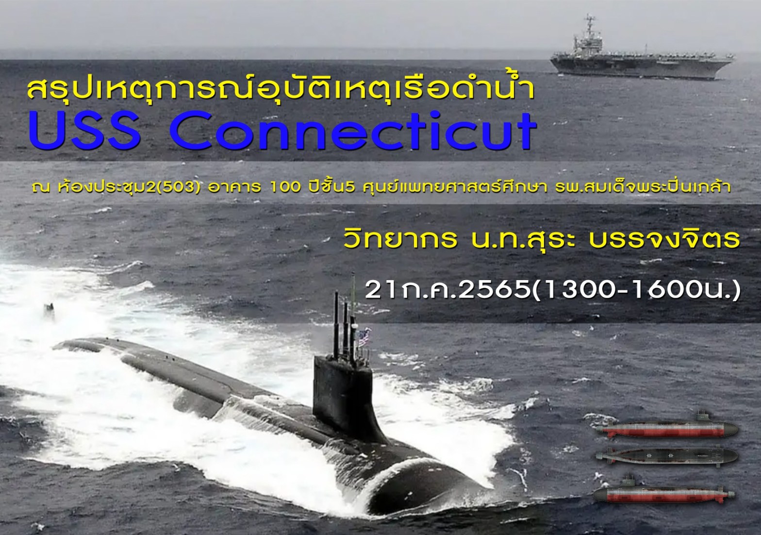 วิทยากรพิเศษ บรรยายสรุปเหตุการอุบัติเหตุเรือดำน้ำสหรัฐฯ ชนพื้นใต้น้ำ ให้กับกองเวชศาสตร์ใต้น้ำและการบิน กรมแพทย์ทหารเรือ กรกฎาคม 2565